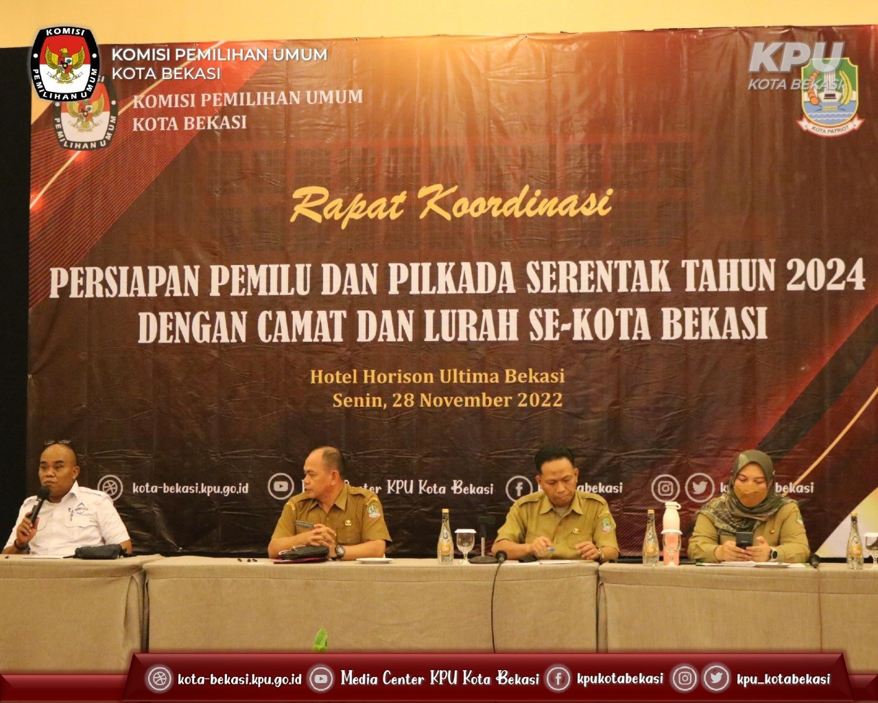 Komisi Pemilihan Umum (KPU) Kota Bekasi menggelar Rapat Koordinasi Persiapan Pemilu dan Pilkada Serentak Tahun 2024 dengan Camat dan Lurah Se Kota Bekasi, Senin (28/11) bertempat di Hotel Horison Ultima Kota Bekasi.