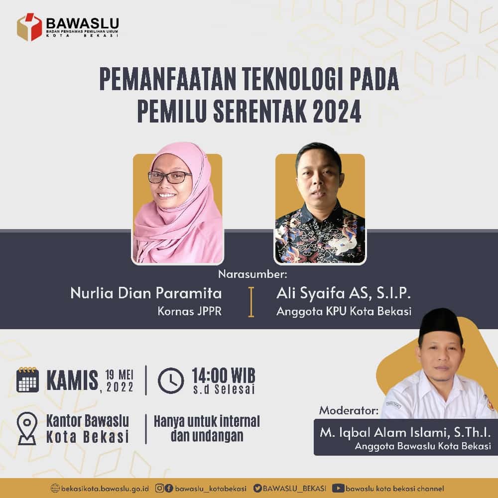 Bekasi, kota-bekasi.kpu.go.id– Anggota KPU Kota Bekasi, Ali Syaifa, hadir sebagai narsumber dalam kegiatan diskusi diselenggarakan Bawaslu Kota Bekasi (19/5). Diskusi dibuka oleh Choirunnisa Ketua Bawaslu Kota Bekasi dan dipandu oleh M Iqbal anggota Bawaslu Kota Bekasi, juga berbicara sebagai narasumber Nurlia Dian Paramita Kornas JPPR. Kegiatan diskusi tersebut mengusung tema Pemanfaatan Teknologi pada Pemilu Serentak 2024.