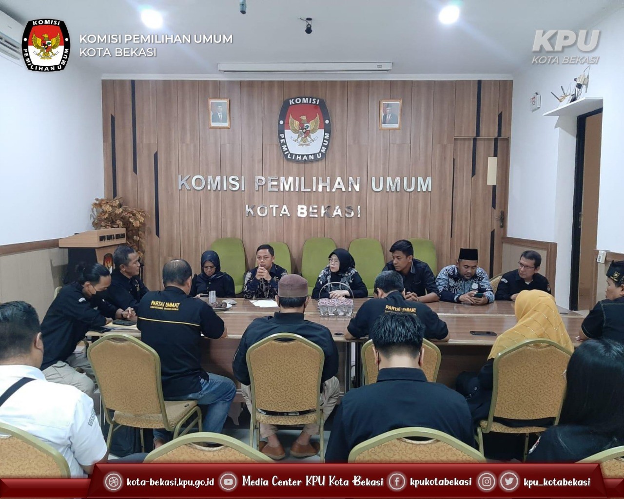 Diterima di aula KPU Kota Bekasi, Ketua DPD Partai Ummat Kota Bekasi, Supriyadi menyatakan kedatangannya untuk bersilaturahmi dan memperkenalkan jajaran Pengurus DPD Partai Ummat Kota Bekasi.