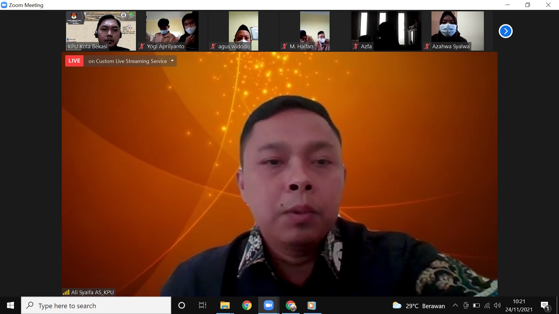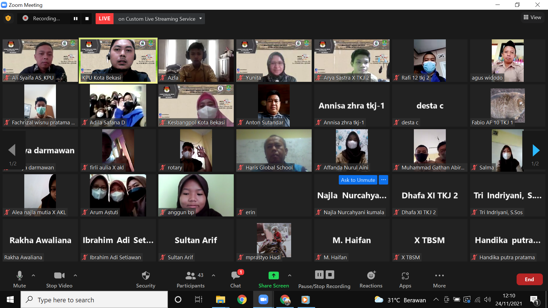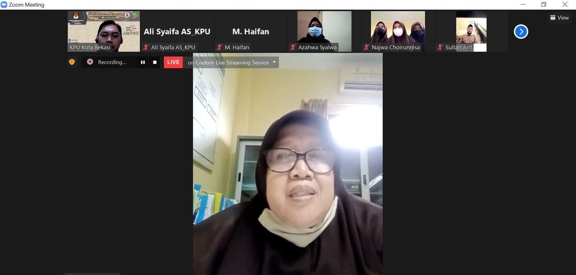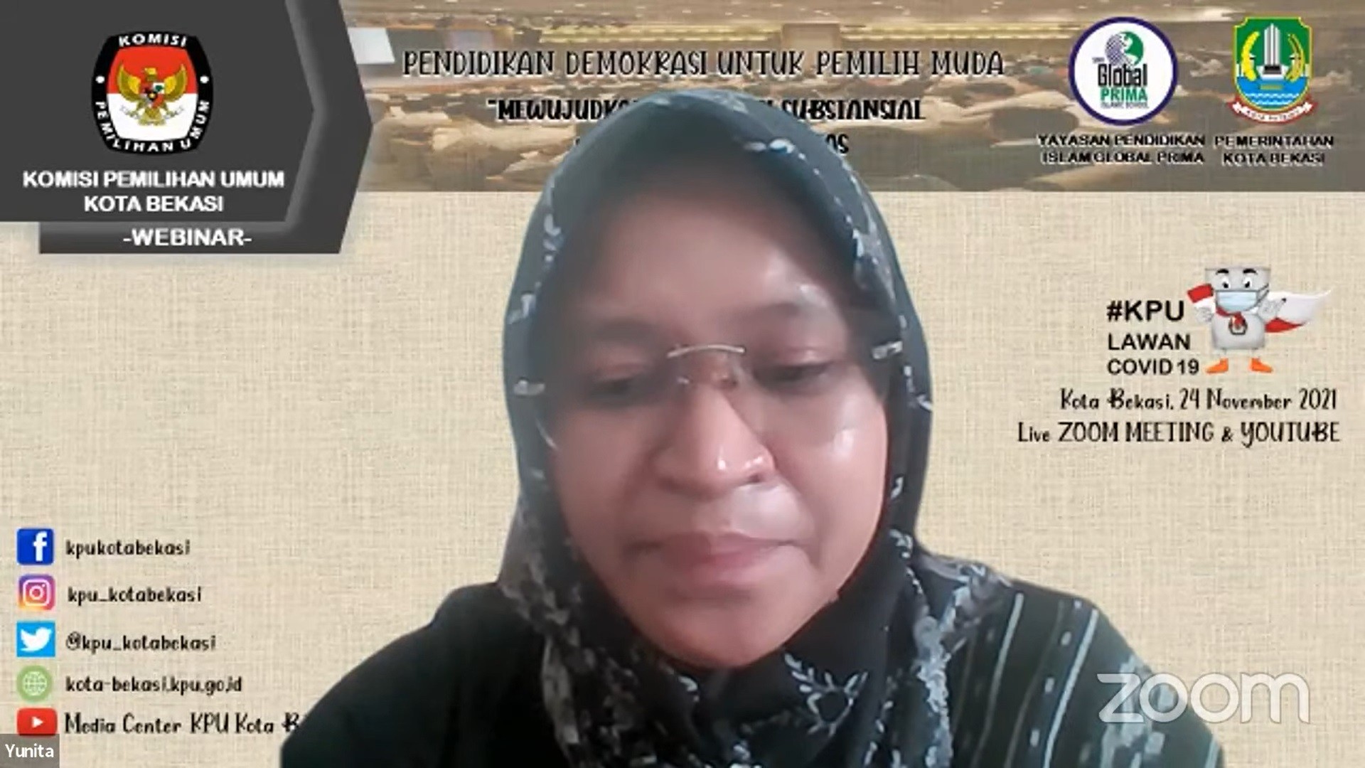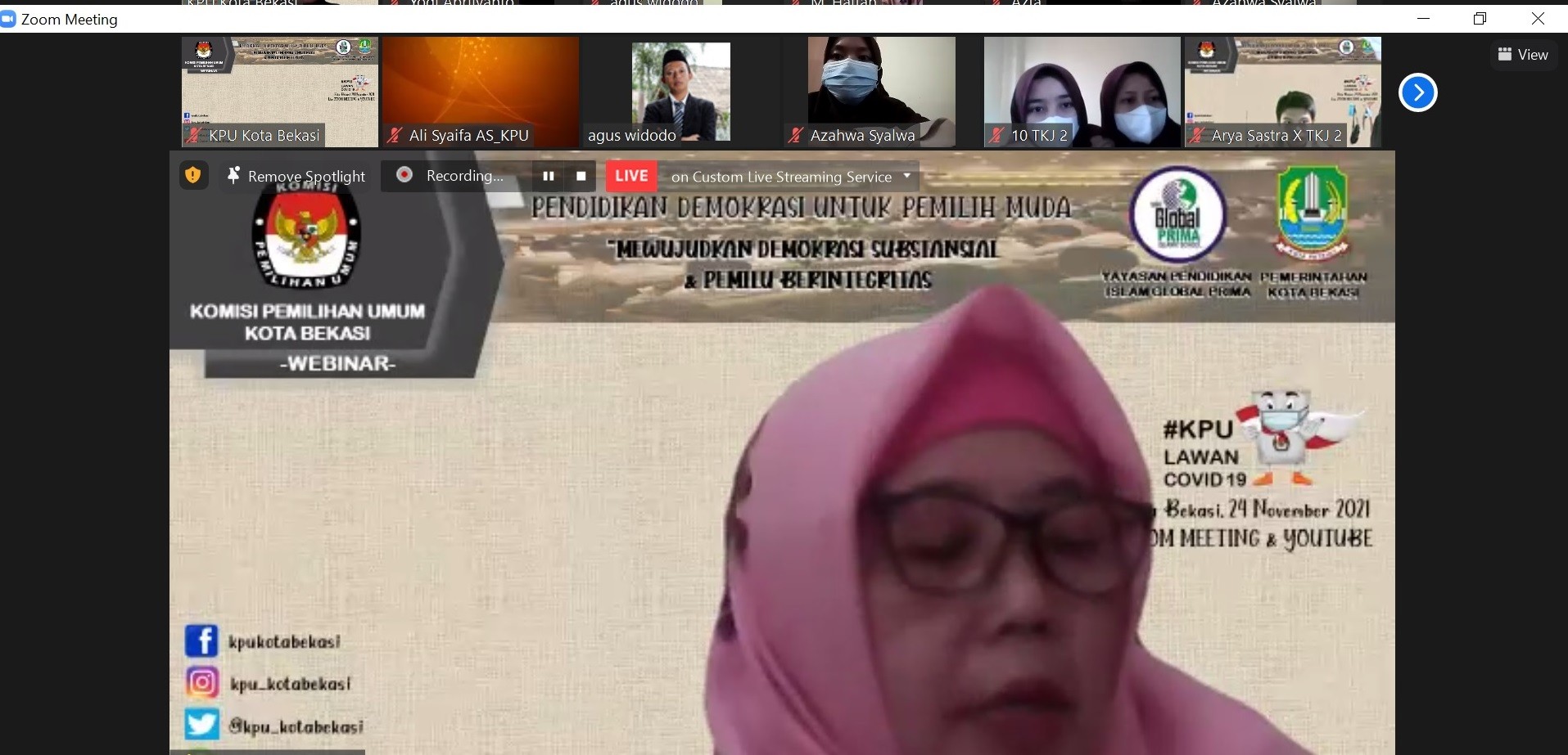 Rabu 24 Nopember 2021 KPU Kota Bekasi Bersama SMK Global Prima Bekasi menyelenggarakan webinar dalam rangka Peningkatan Partisipasi Pemilih Muda dengan menghadirkan Narasumber Kesbangpol Kota Bekasi (Dra. Susilowati, MM), Anggota KPU Kota Bekasi (Yunita Utami P), dan Moderator Guru SMK Global Prima Kota Bekasi Agus Widodo. Turut hadir dan memberikan sambutan dalam kegiatan tersebut, Anggota KPU Kota Bekasi Ali Syaifa AS, dan Kepala Sekolah SMK Global Prima Bekasi, Ibu Tri Indrayani, S.Sos.