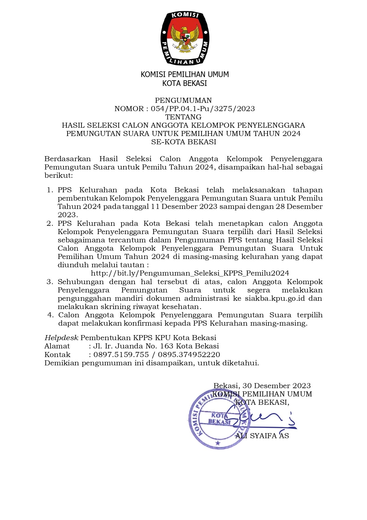 Pengumuman Hasil Seleksi Anggota KPPS KPU Kota Bekasi Pemilu 2024