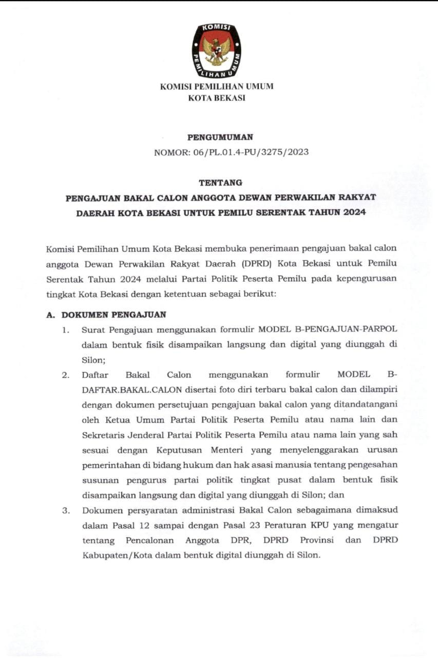 PENGUMUMAN PENGAJUAN BAKAL CALON ANGGOTA DPRD KOTA BEKASI PADA PEMILU TAHUN 2024