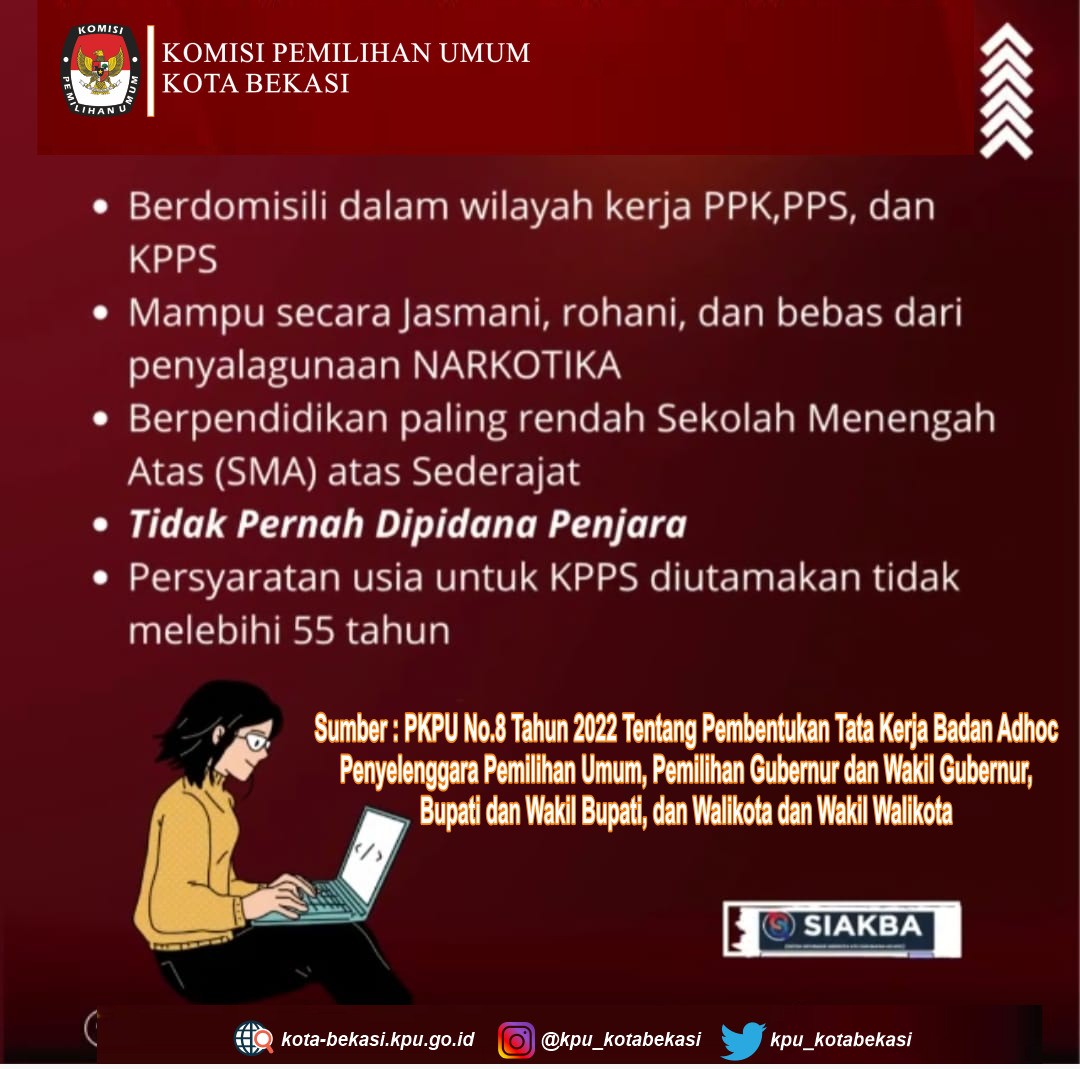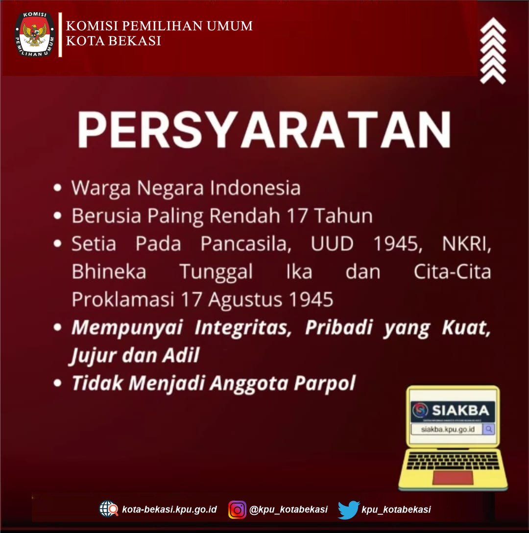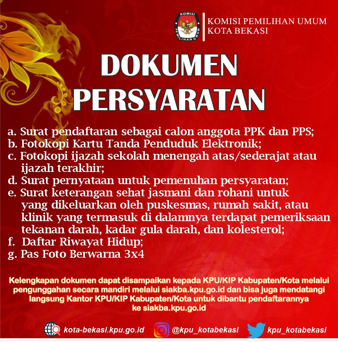 Berikut persyaratan PPK, PPS dan KPPS dan dokumen persyaratan yang perlu disiapkan. Semua dokumen diunggah melalui aplikasi SIAKBA. Terus pantau akun media sosial KPU Kota Bekasi untuk update informasi.