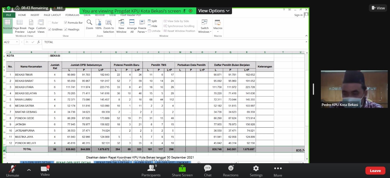 KPU Kota Bekasi telah melaksanakan Rekapitulasi Daftar Pemilih Berkelanjutan Tahun 2021 periode bulan September. Rekapitulasi Daftar Pemilih Berkelanjutan Tahun 2021 periode bulan September dilaksanakan melalui Rapat Koordinasi KPU Kota Bekasi dengan stakeholder terkait pada tanggal 30 September 2021 bertempat di Kantor KPU Kota Bekasi melalui media daring dengan aplikasi zoom meeting yang dihadiri oleh Bawaslu Kota Bekasi, Polres Metro Bekasi Kota, Disdukcapil Kota Bekasi dan Kesbangpolinmas Kota Bekasi beserta jajaran Komisioner dan Sekretariat KPU Kota Bekasi.