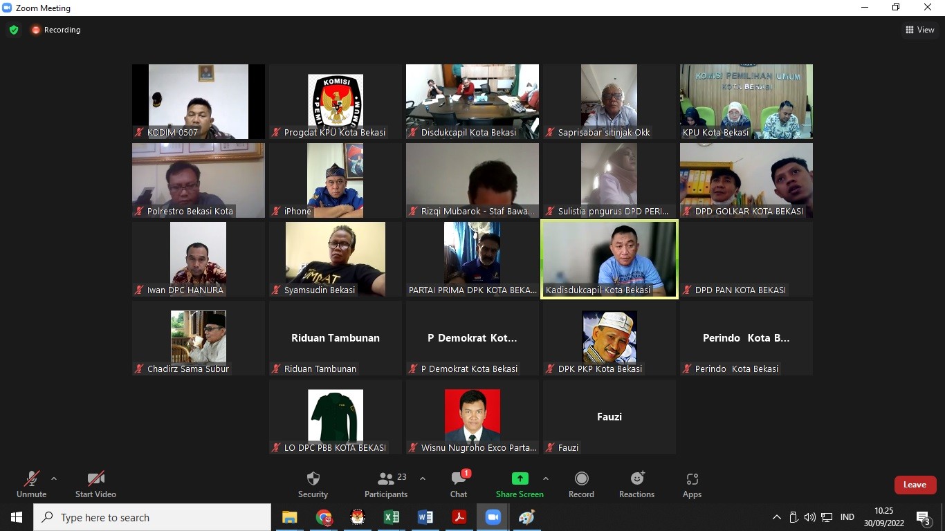 KPU Kota Bekasi telah melaksanakan Rekapitulasi Daftar Pemilih Berkelanjutan periode bulan September Tahun 2022. Rekapitulasi dilaksanakan melalui Rapat Koordinasi secara daring yang dihadiri oleh Ketua dan Anggota KPU Kota Bekasi, Bawaslu Kota Bekasi, Partai Politik tingkat Kota Bekasi, Polres Metro Bekasi Kota, Kodim 0507/Bekasi, Disdukcapil Kota Bekasi, serta jajaran Sekretariat KPU Kota Bekasi.