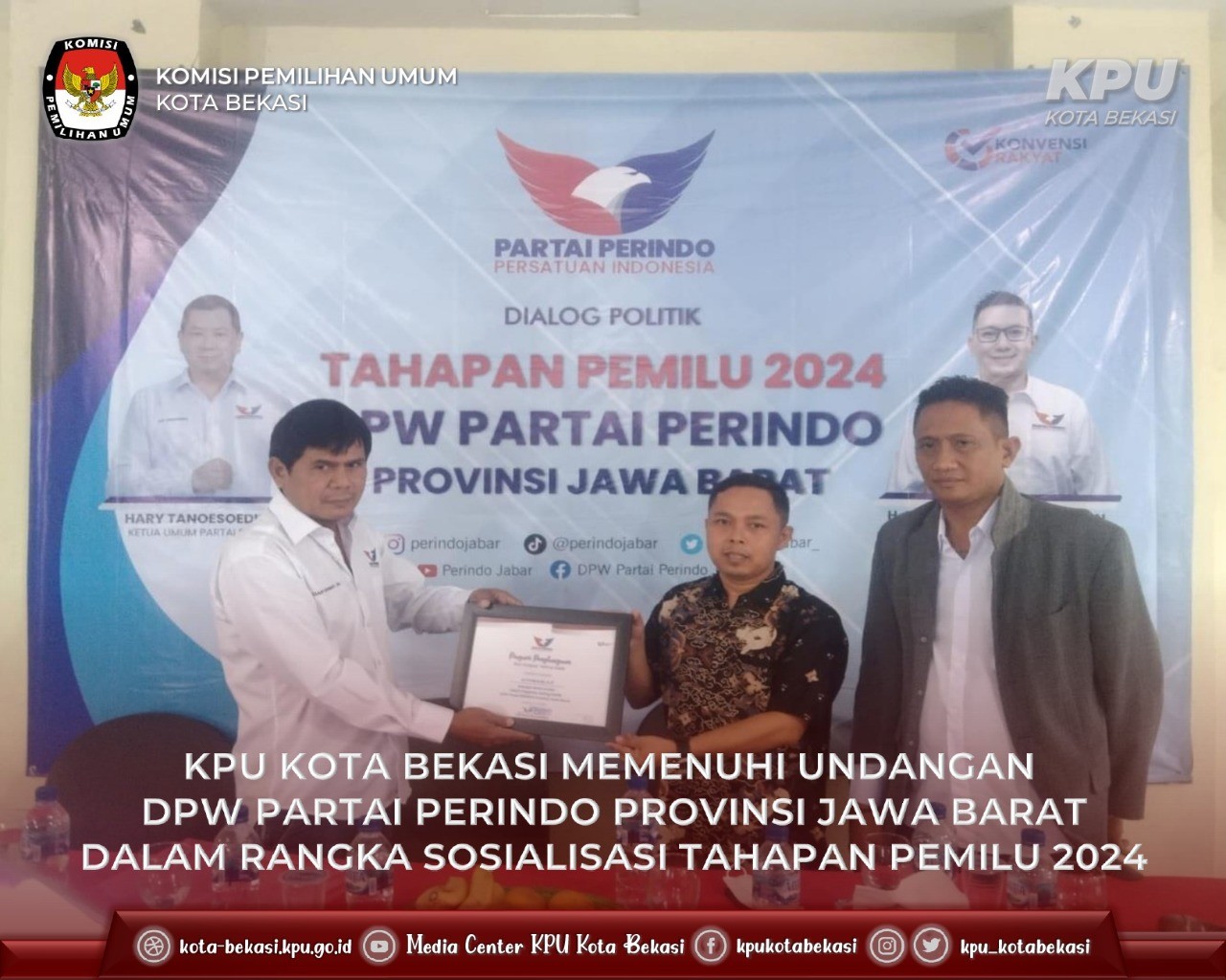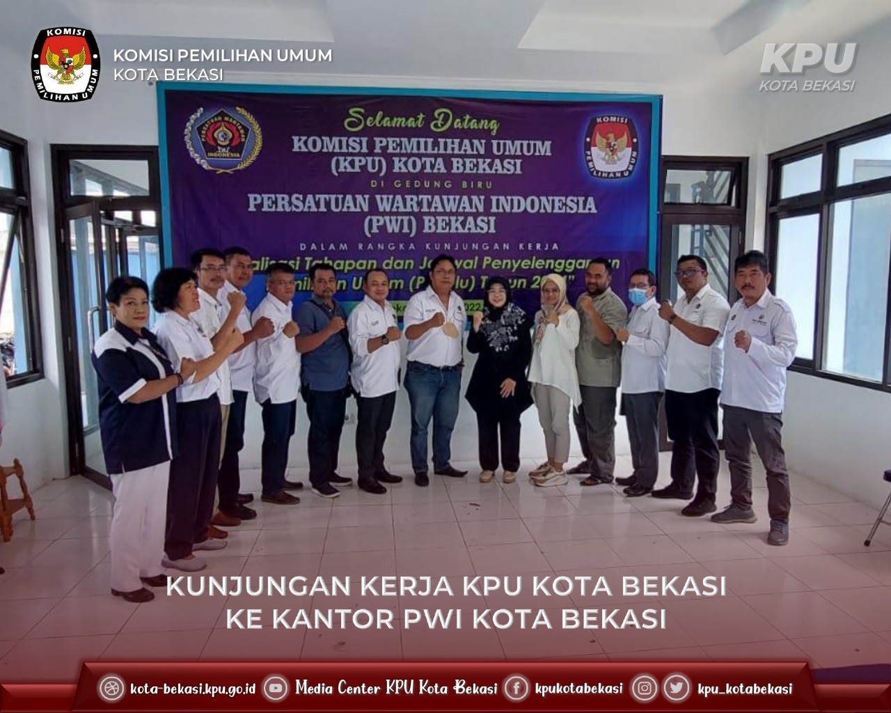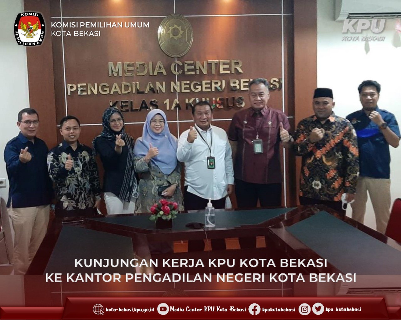 KPU Kota Bekasi yang dipimpin langsung oleh Ketua KPU Kota Bekasi, Nurul Sumarheni diterima oleh Ketua Pengadilan Negeri Bekasi, Bongbongan Silaban, S.H., L.L.M., dan Wakil Ketua Pengadilan Negeri Bekasi Dadi Rachmadi, S.H., M.H. di ruang media center Pengadilan Negeri Bekasi. Kegiatan kunjungan yang berlangsung tersebut membahas mengenai penyelenggaran tahapan Pemilu 2024 di Kota Bekasi.