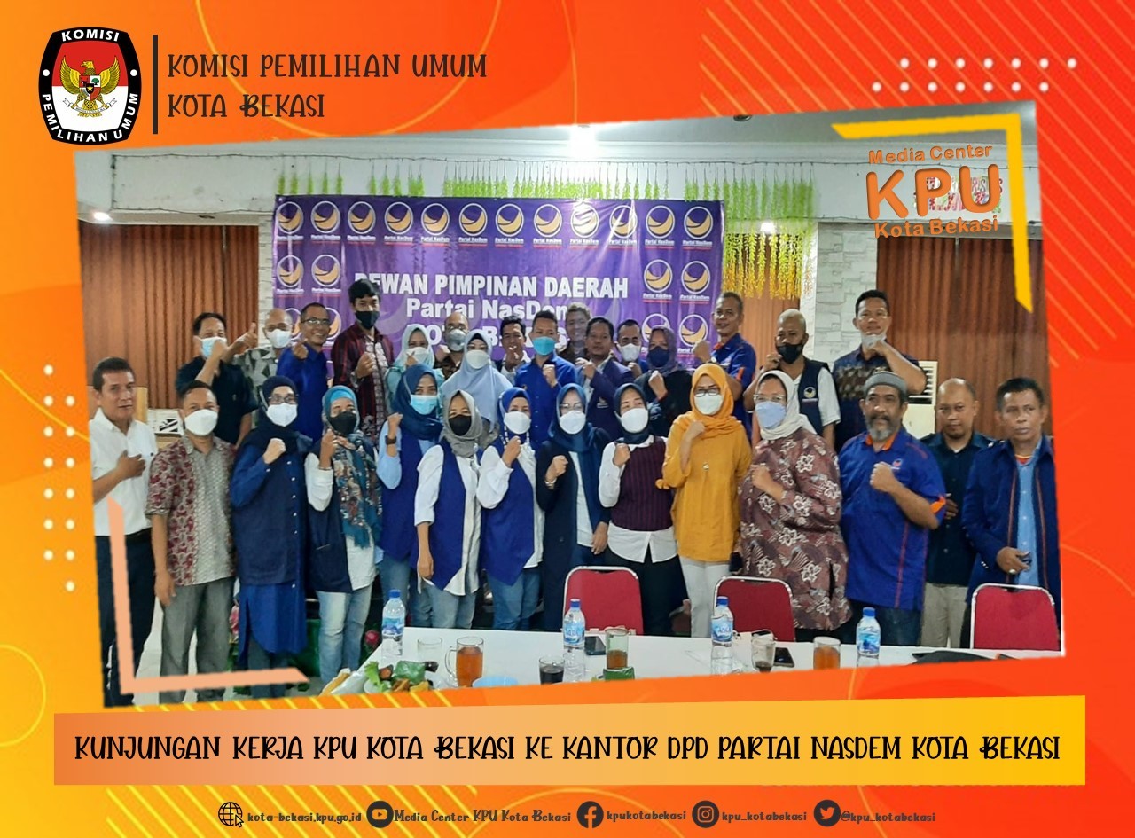 Komisi Pemilihan Umum ( KPU ) Kota Bekasi kembali melakukan kunjungan ke partai politik di Kota Bekasi. Kali ini kunjungan dilakukan di Kantor DPD Partai Nasional Demokrat (Nasdem) Kota Bekasi, Kamis (31/03/2022). Kunjungan yang dilakukan oleh KPU Kota Bekasi tersebut diterima oleh ketua DPD Partai Nasdem Kota Bekasi Aji Ali Sabana beserta jajaran pengurus DPD Partai Nasdem.