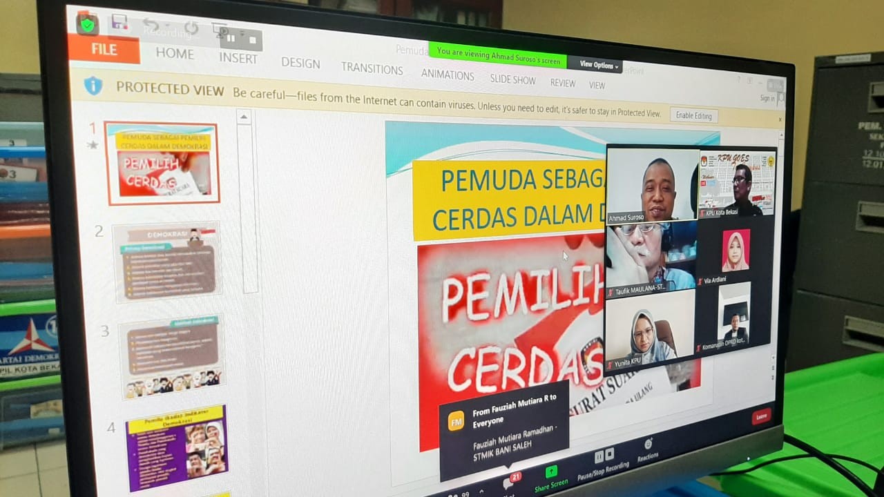 Dengan mengangkat tema “Pemuda Sebagai Pemilih Cerdas Dalam Demokrasi” Kegiatan KPU Goes To Campus tahap 1 diselenggarakan pada hari Minggu, tanggal 15 November 2020, yang diikuti peserta sebanyak 155 orang peserta Mahasiswa/i dengan sebagai Narasumber Bapak Amat Suroso, S. Kom., M. Kom. (Dosen STMIK Bani Saleh), Bapak Komarudin (Anggota DPRD Kota Bekasi) dan Ibu Yunita Utami Panuntun (Komisioner KPU Kota Bekasi Divisi Sosialisasi, Pendidikan Pemilih, Partisipasi Masyarakat dan SDM) serta Bapak M. Thomas Iqbal (Kasubag Teknis dan Hubmas KPU Kota Bekasi) sebagai Moderator.