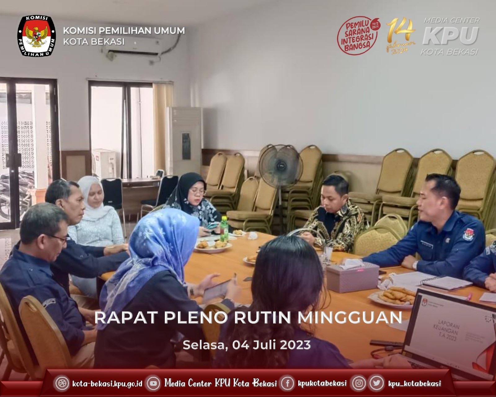 Bekasi - KPU Kota Bekasi melaksanakan Rapat Pleno Rutin Mingguan di Aula Tb. Hendi Irawan Kantor KPU Kota Bekasi, Selasa (04/07/2023). Kegiatan Rapat dipimpin oleh Ketua KPU Kota Bekasi, Nurul Sumarheni dan dihadiri oleh Anggota KPU Kota Bekasi, Ali Syaifa dan Yunita Utami Panuntun, Sekretaris KPU Kota Bekasi Andy Firmanda,beserta para Kasubag dan staff di lingkungan sekretariat KPU Kota Bekasi.