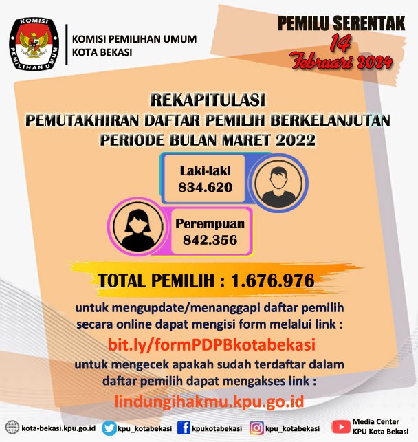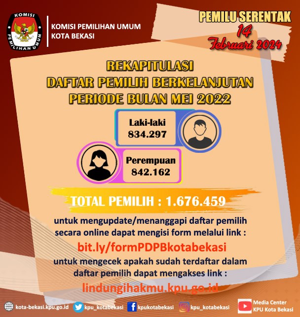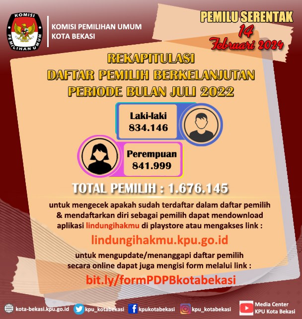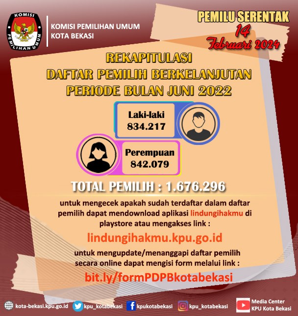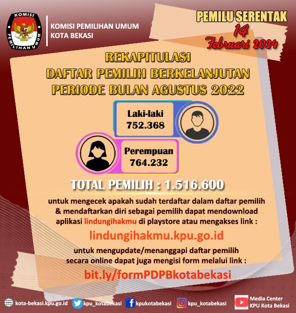 KPU Kota Bekasi telah melaksanakan Rekapitulasi Daftar Pemilih Berkelanjutan Tahun 2022 periode bulan Agustus. Rekapitulasi Daftar Pemilih Berkelanjutan Tahun 2022 periode bulan Agustus dilaksanakan melalui Rapat Koordinasi Internal Bulanan KPU Kota Bekasi pada tanggal 31 Agustus 2022 bertempat di Kantor KPU Kota Bekasi. Rekapitulasi dilaksanakan berdasarkan ketentuan Peraturan Komisi Pemilihan Umum Republik Indonesia Nomor 6 Tahun 2021 Perihal Pemuktahiran Data pemilih Berkelanjutan. Berdasarkan ketentuan PKPU RI tersebut KPU Kabupaten/Kota melakukan Rekapitulasi Daftar Pemilih Berkelanjutan secara berkala setiap bulan dan menyampaikan hasil rekapitulasi serta Daftar Pemilih Hasil DPB setiap bulan kepada Partai Politik, Bawaslu, dan Dinas yang menangani urusan Kependudukan dan Catatan Sipil setempat. Jumlah pemilih yang telah dilakukan pencermatan dan direkap pada Rapat Koordinasi Bulanan Rekapituasi Daftar Pemilih Berkelanjutan Tahun 2022 periode bulan Agustus adalah sebanyak 1.516.600 pemilih, dengan rincian pemilih laki-laki berjumlah 752.368 pemilih dan pemilih perempuan berjumlah 764.232 pemilih yang tersebar di 12 Kecamatan se-Kota Bekasi. Terdapat 18 orang pemilih baru yang berasal dari data Pemilih Pemula dan Data Pemilih Pindah Masuk menjadi Warga Kota Bekasi berdasarkan laporan masyarakat yang masuk melalui aplikasi lindungihakmu dan hasil verifikasi faktual terbatas. Sementara pemilih yang Tidak Memenuhi Syarat (TMS) sebanyak 159.585 Pemilih yang terdiri dari Pemilih yang Meninggal dunia, pindah keluar dari Kota Bekasi serta pemilih Ganda. KPU RI menyediakan sarana bagi warga masyarakat yang ingin melakukan pengecekan apakah telah terdaftar dalam Daftar Pemilih serta melaporkan diri untuk mendaftar menjadi pemilih dengan mengakses alamat link : lindungihakmu.kpu.go.id atau download aplikasi Lindungi Hakmu yang dikembangkan oleh KPU RI di Google Play Store melalui link : https://play.google.com/store/apps/details?id=com.kpu.ppdb. Selain itu KPU Kota Bekasi juga menyediakan sarana bagi masyarakat yang ingin memberikan tanggapan terhadap Daftar Pemilih secara online melalui link : bit.ly/formPDPBkotabekasi atau dapat juga melaporkan langsung ke Kantor KPU Kota Bekasi Jl. Ir. H. Juanda No.163 Bekasi. KPU Kota Bekasi berterima kasih dan menyampaikan apresiasi kepada seluruh stakeholder yang terlibat dan berharap dapat terus bersinergi bersama dalam melakukan Pemutakhiran Daftar Pemilih Berkelanjutan Tahun 2022. KPU Kota Bekasi juga berharap masyarakat dapat berperan aktif untuk melakukan pengecekan Daftar Pemilih pada sarana yang telah disediakan oleh KPU RI diatas dan mendaftarkan diri apabila belum terdaftar dalam Daftar Pemilih atau apabila terdapat Anggota Keluarga yang sudah Tidak Memenuhi Syarat sebagai pemilih sesuai peraturan perundangan untuk bersama-sama mewujudkan data pemilih yang makin berkualitas dan aktual di Kota Bekasi.
