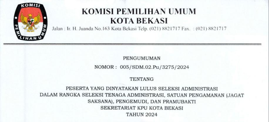 PESERTA YANG DINYATAKAN LULUS SELEKSI ADMINISTRASI DALAM RANGKA SELEKSI TENAGA ADMINISTRASI, SATUAN PENGAMANAN (JAGAT SAKSANA), PENGEMUDI, DAN PRAMUBAKTI SEKRETARIAT KPU KOTA BEKASI TAHUN 2024. Klik disini