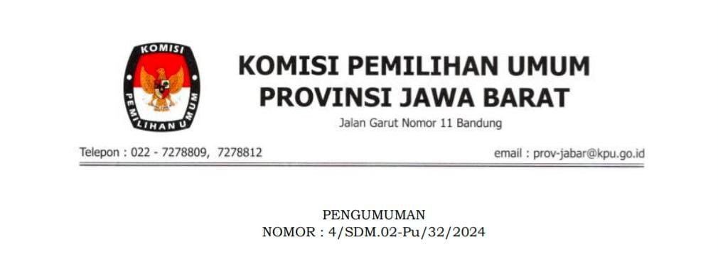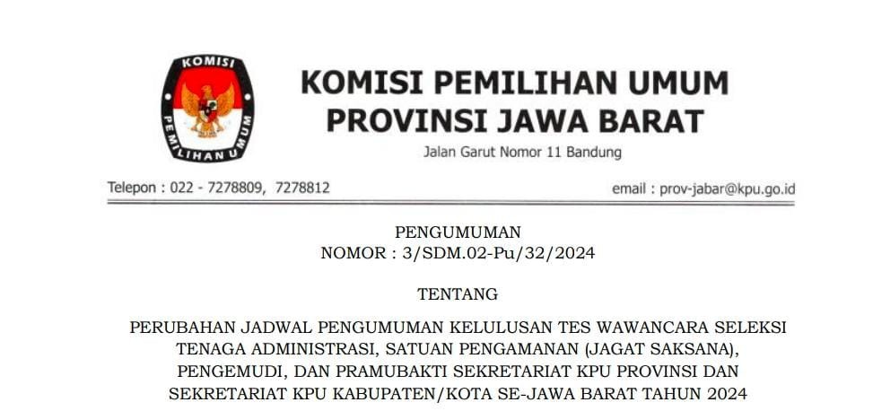 PERUBAHAN JADWAL PENGUMUMAN KELULUSAN TES WAWANCARA SELEKSI TENAGA ADMINISTRASI, SATUAN PENGAMANAN (JAGAT SAKSANA), PENGEMUDI, DAN PRAMUBAKTI SEKRETARIAT KPU PROVINSI DAN SEKRETARIAT KPU KABUPATEN/KOTA SE-JAWA BARAT TAHUN 2024. KLIK DISINI