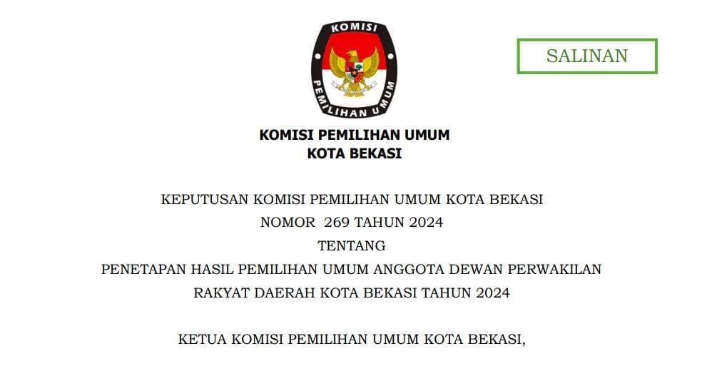 Berikut disampaikan Berita Acara dan Sertifikat Rekapitulasi Hasil Penghitungan Perolehan Suara di Tingkat Kota Bekasi pada Pemilu Tahun 2024.