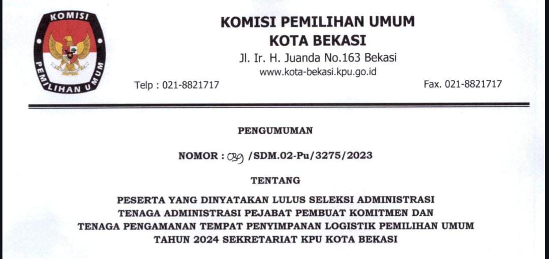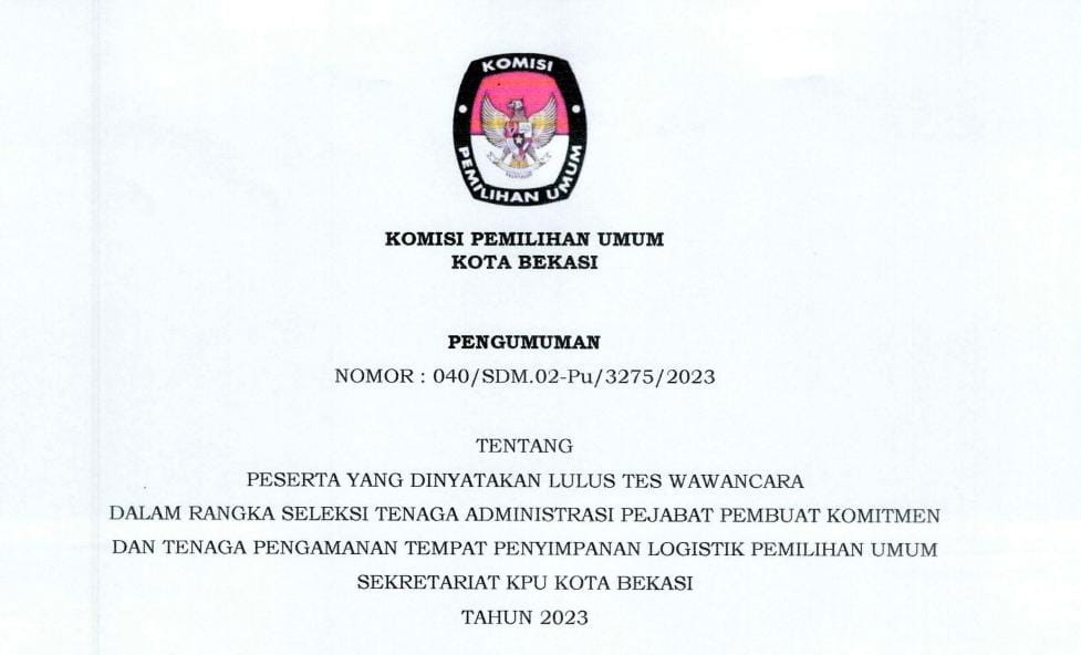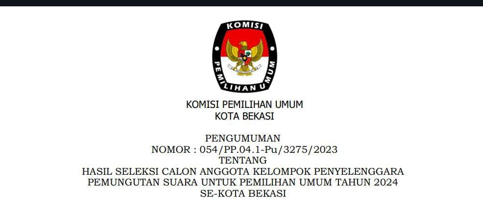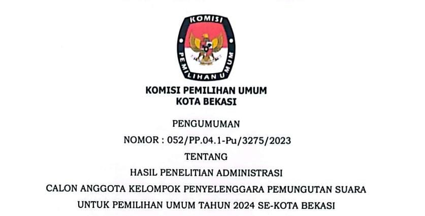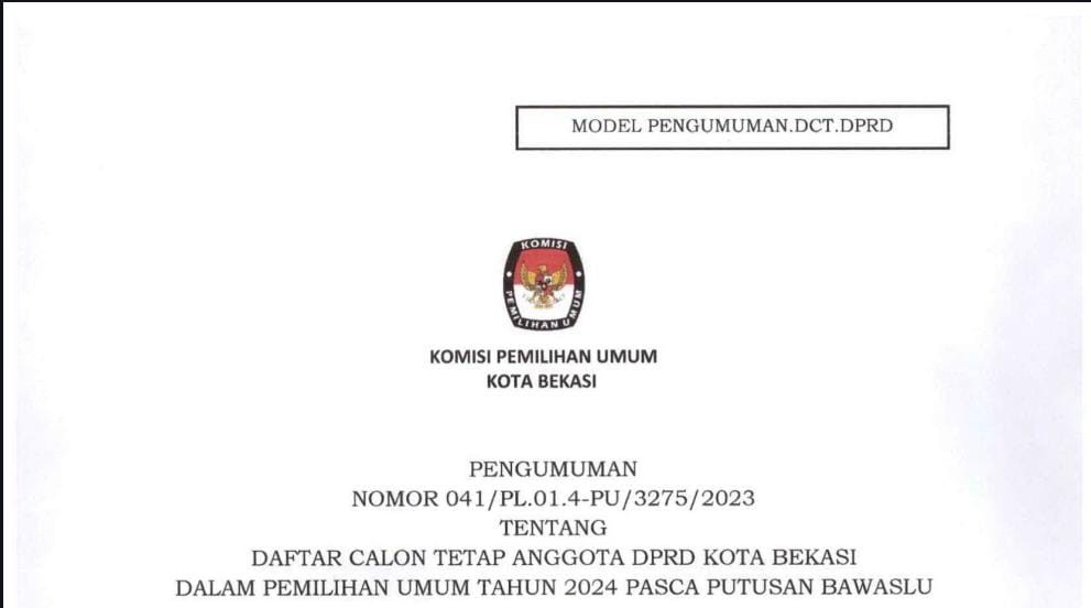 Bahwa untuk melaksanakan ketentuan Pasal 85 Peraturan KPU Nomor 10 Tahun 2023 tentang Pencalonan Anggota Dewan Perwakilan Rakyat, Dewan Perwakilan Rakyat Daerah Provinsi, dan Dewan Perwakilan Rakyat Daerah Kabupaten/Kota, KPU Kota Bekasi mengumumkan Daftar Calon Tetap (DCT) Anggota DPRD Kota Bekasi dan persentase keterwakilan perempuan dalam Daftar Calon Tetap (DCT) sebagaimana terlampir.