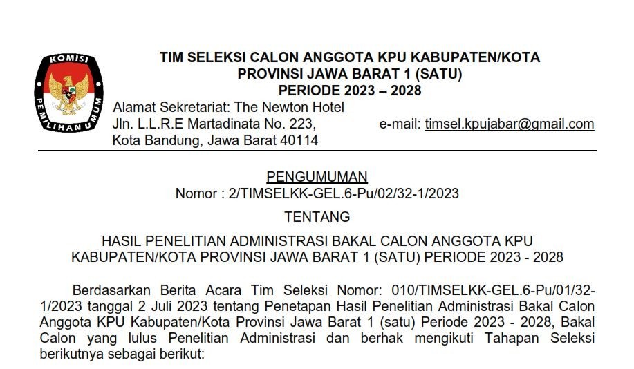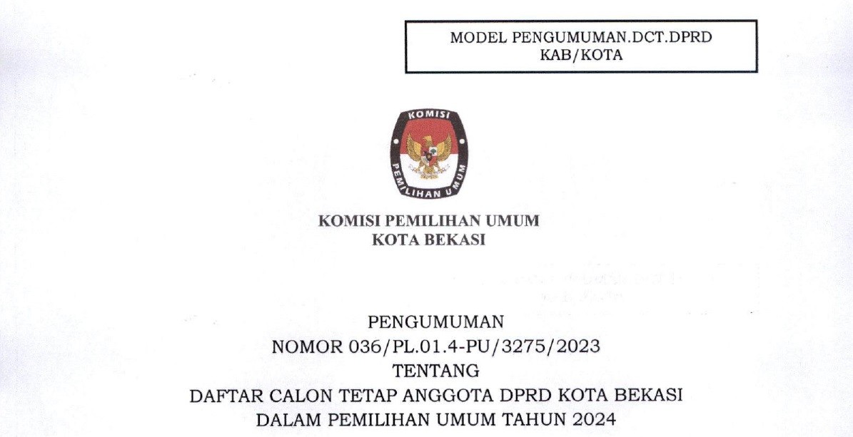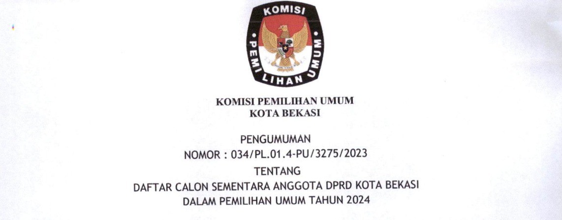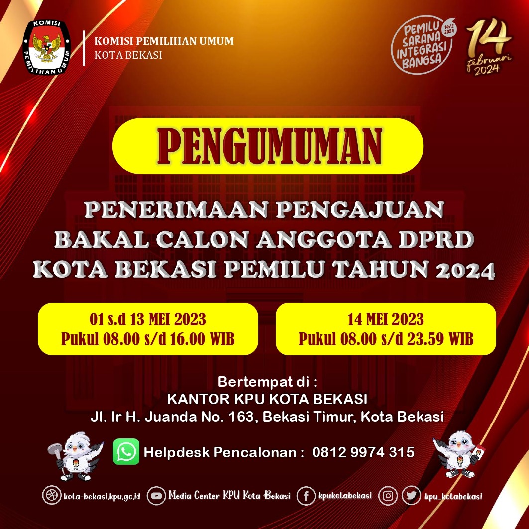 Sesuai dengan Peraturan Komisi Pemilihan Umum Republik Indonesia No. 10 Tahun 2023 tentang Pencalonan Anggota Dewan Perwakilan Rakyat, Dewan Perwakilan Rakyat Daerah Provinsi, dan Dewan Perwakilan Rakyat Daerah Kabupaten/Kota, bersama ini kami informasikan bahwa KPU Kota Bekasi membuka pengajuan bakal calon Anggota Dewan Perwakilan Rakyat Daerah Kota Bekasi yang dapat diajukan oleh Partai Politik peserta Pemilu Tahun 2024 tingkat Kota Bekasi, mulai tanggal 1 -14 Mei 2023.
