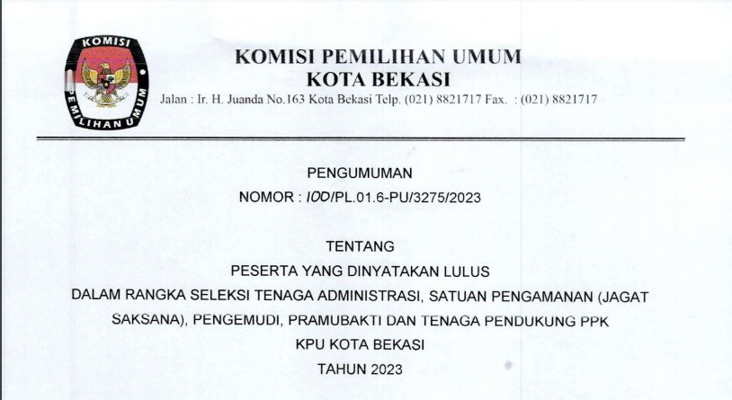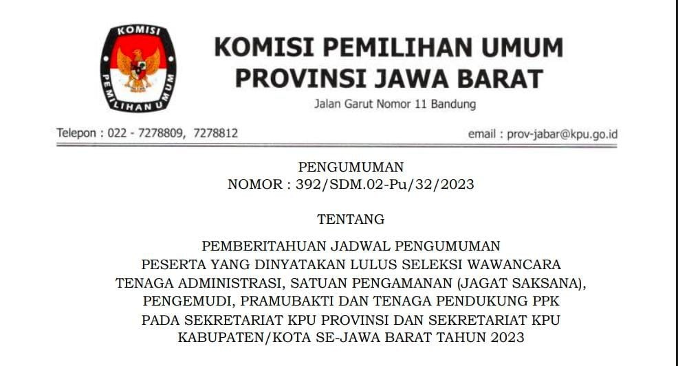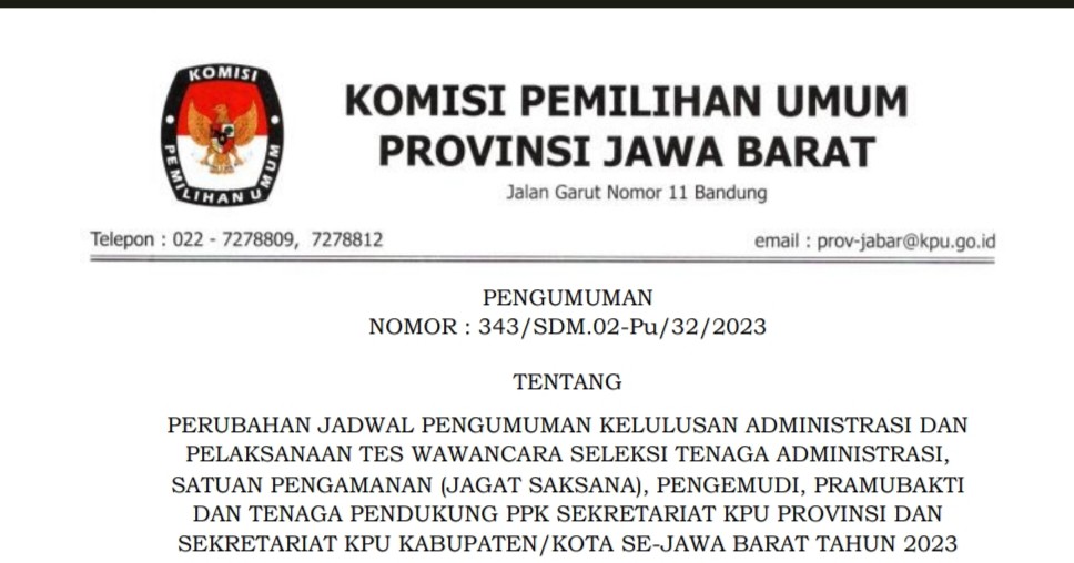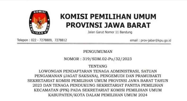 Sekretaris Komisi Pemilihan Umum Provinsi Jawa Barat, memberi kesempatan kepada putra – putri terbaik bangsa untuk menjadi Tenaga Administrasi, Satuan Pengamanan (Jagat Saksana), Pengemudi, Pramubakti dan Tenaga Pendukung Sekretariat PPK Tahun Anggaran 2023.Informasi selengkapnya UNDUH DISINI